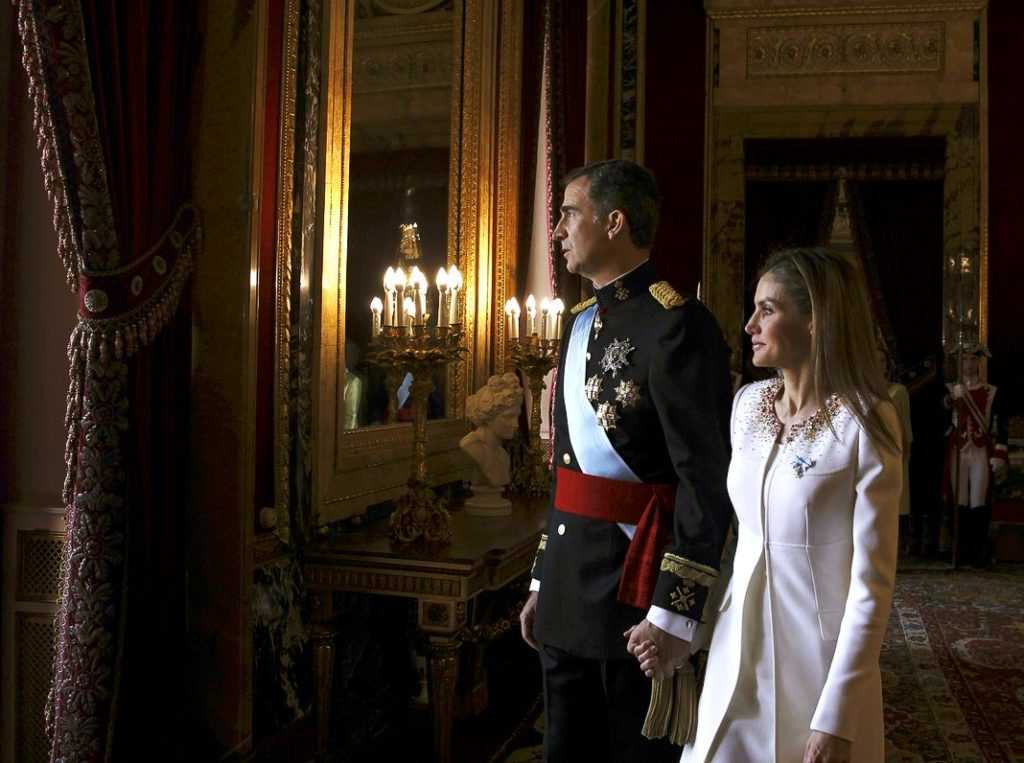 Король Испании Филипп VI и королева Испании Летисия готовятся появиться на балконе Королевского дворца во время официальной церемонии коронации короля в Мадриде, 19 июня 2014 г.