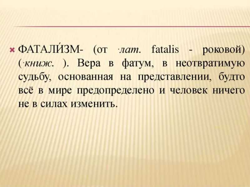 - Значение слова фаталист происходит от латинского fatum – судьба, рок.