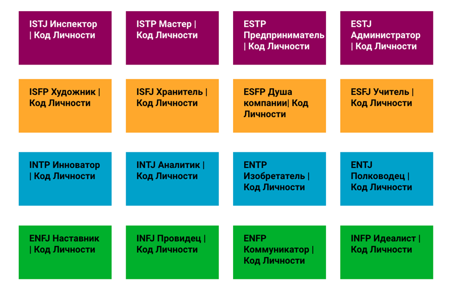 Всего насчитывают 16 типов личности, которые определяются на основании теории Карла Юнга, изложенной в интерпретации Изабель Майерс и ее матери Кэтрин Бриггс. Этот тест помогает разграничить дизайн человека в соответствии с когнитивными, личностными, коммуникационными, карьерными особенностями.