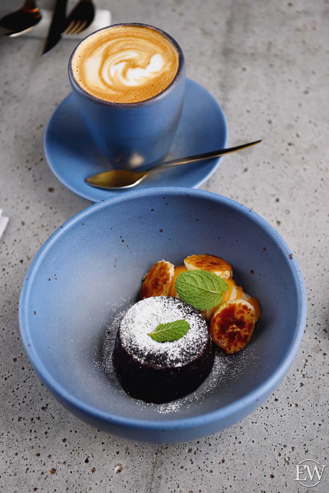 Шоколадный фондан с мороженым из фундука и карамели (520 р.). Стоит надломить ложкой держащий форму шоколадный кекс, как из самой его сердцевины начнет растекаться густой темный шоколад. Плотную шоколадную текстуру прекрасно оттенит лёгкое мороженое с бананово-ореховыми нотками.