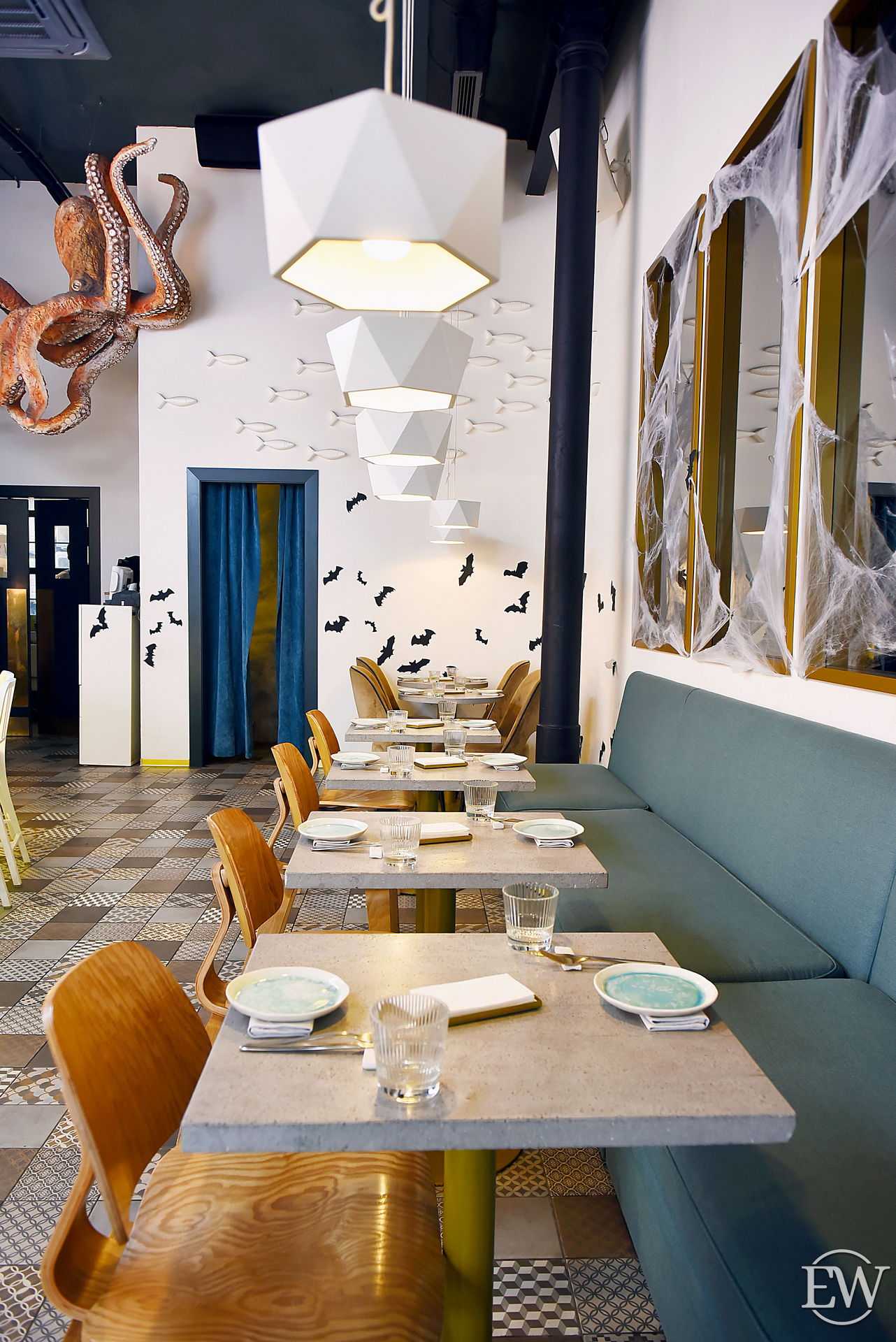 Сама атмосфера заведения притягивает своей воздушностью и ощущением легкой безмятежности. И, кажется, каждая деталь интерьера подчеркивает идиллию выходных: элегантная морская тематика, шикарная ванна, в которой охлаждается шампанское и просекко, открытый вид на набережную. Шепнём тайком, что звезды театра, кино и телевидения зачастую заглядывают сюда насладиться свежими деликатесами и дарами моря.