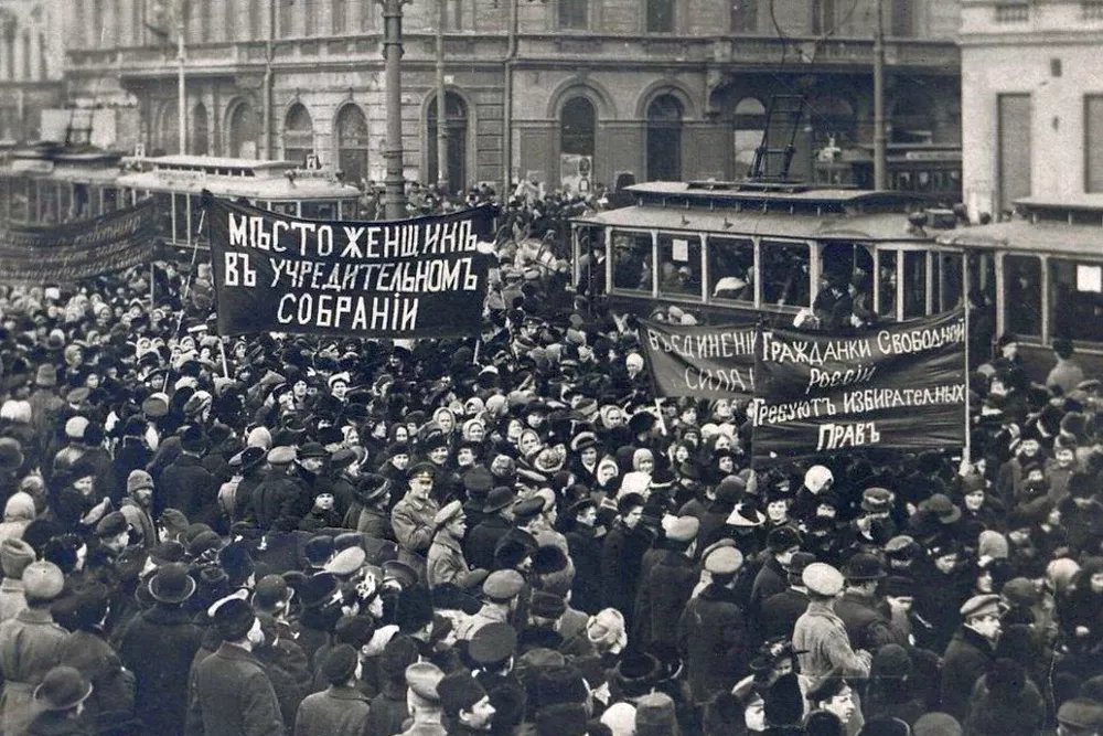 1917 год стал переломным для России: 23 февраля или 8 марта по «новому стилю» прогремели первые взрывы, положившие начало Февральской революции. Женщины вышли на улицы, призывая петроградских революционеров к активным действиям. По современным оценкам, в тот день на улицы вышли почти 130 тыс. протестующих. Так петроградские женщины фактически запустили революционный процесс, а в день отречения императора отправили Временному правительству заявление с требованиями включить женщин в работу Учредительного собрания. Однако, оставшись без ответа, 19 марта они вновь вышли на демонстрацию: 40 тыс. женщин получили от правительства обещание решить «женский вопрос». Летом 1917 года был принят закон, согласно которому все женщины старше 21 года получили право голосовать на выборах. Так российские женщины добились избирательного права на три года раньше, чем женщины США, и на год раньше, чем британки — ими во многом вдохновлялись английские и американские суфражистки.