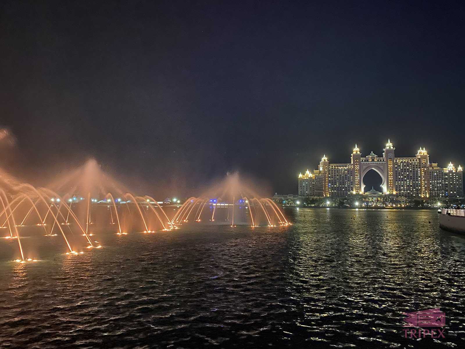 Также, как фонтаны у Бурдж Халифы, фонтаны на Пальме феерично «танцуют и поют» под европейские и арабские мотивы. Только вид другой — на шикарный Атлантис, и музыка громче — благодаря более мощной Hi-End системе.