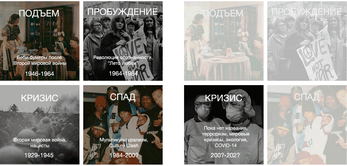 Предыдущая эпоха кризиса закончилась вместе со Второй мировой войной. Это было время Молчаливого поколения. В послевоенные годы начался период подъема, который объединил людей. Так появилось поколение беби-бумеров. За ним началось долгожданное пробуждение — борьба за права, развитие феминизма, появление хиппи. Здесь рождается поколение Х. После «Лета любви» идет период, где сталкивается несколько культур — и никто не знает, как на это реагировать. Начинается эпоха спада, в которой рождаются миллениалы.