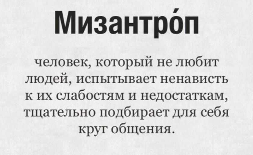 01Мизантроп — это человек со здоровой психикой. Его мировоззрение — это его собственный осознанный выбор. При этом у мизантропа есть узкий круг близких людей, на которых не распространяется неприязненное отношение.