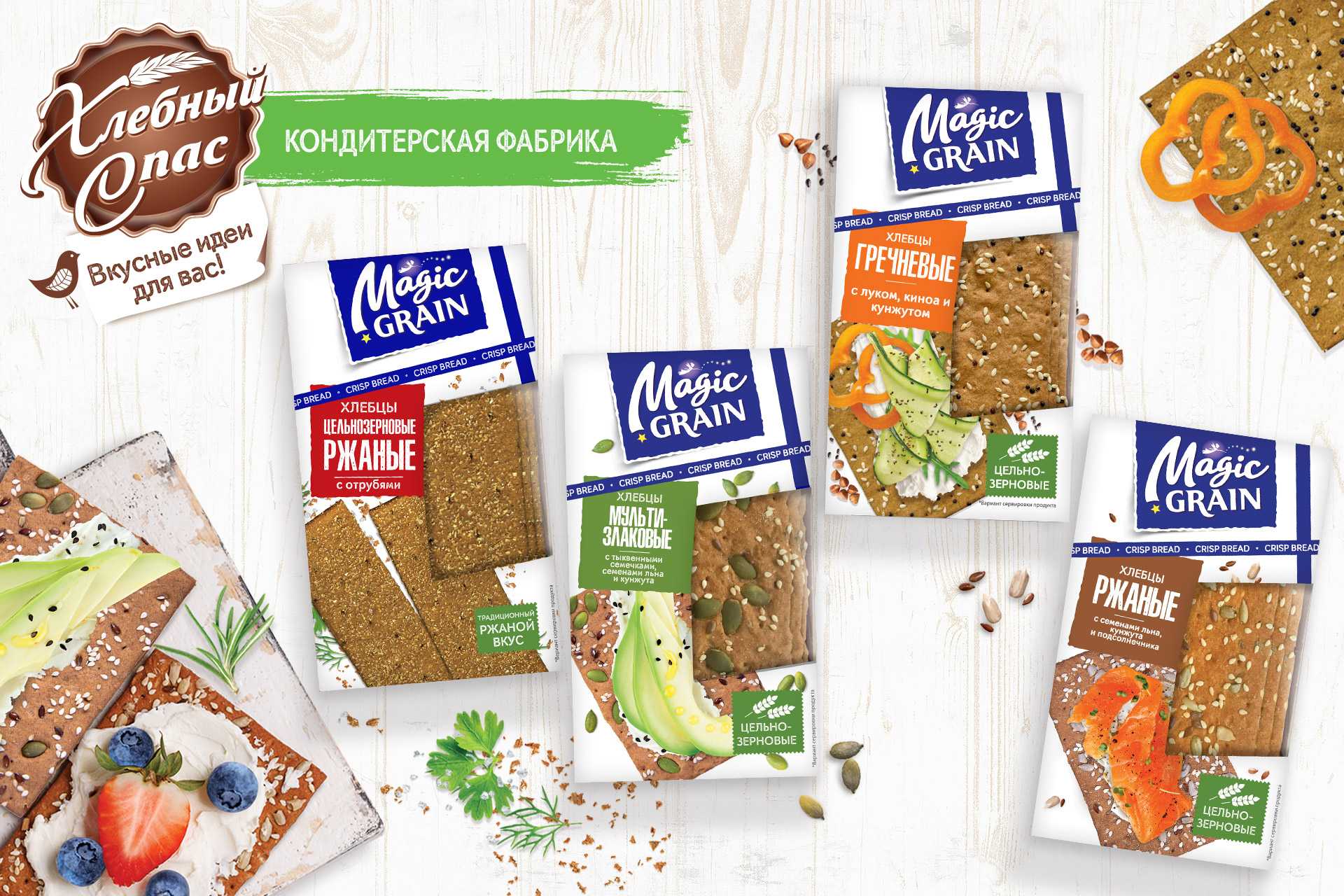 Линейка хрустящих хлебцев ТМ Magic Grain, уже известная такими видами, как: «Мультизлаковые» с тыквенными семечками, семенами льна и кунжута и «Ржаные» с семенами льна, кунжута и подсолнечника, пополнилась новыми вкусами: «Гречневые» с луком, киноа и кунжутом и Цельнозерновые Ржаные с отрубями.