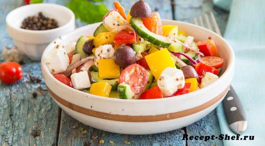 Необходимые ингредиенты: • огурцы – 2 шт. среднего размера • красный болгарский перец – 1 шт. • желтый болгарский перец – 1 шт. • помидоры черри — 200 г • красная луковица – ½ шт. • фета – 220 г • оливки сорта каламата — 100 г • чеснок – 2 зубчика • сухой орегано — 1 ч.л. • горчица — 1/2 ч.л. • красный винный уксус — 50 мл • морская соль — 1 ч.л. • черный перец крупного помола — 1/2 ч.л. • оливковое масло – 120 мл