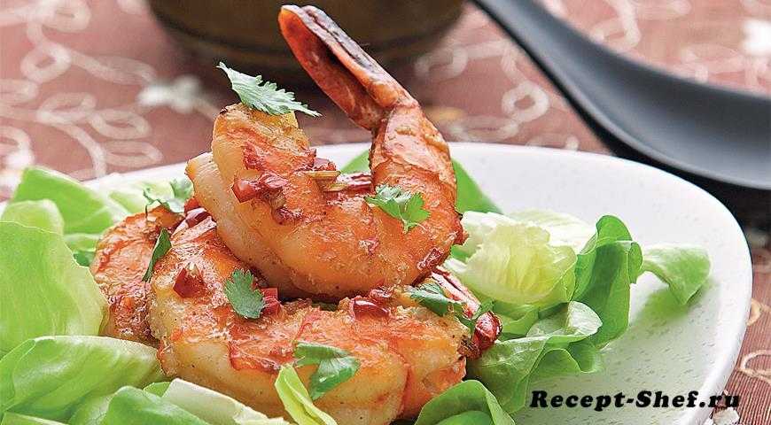 Необходимые ингредиенты: • тигровые креветки (в сыром виде) – 23 шт. • салатные листья – 1 пучок • кинза – небольшой пучок • семена кориандра — 1 ч. л. • порошок карри — 1 ч. л. • растительное масло – 40 мл • соль, черный перец Для заправки: • лимонный сорго — 1 стебель • острый перчик чили – ½ шт. • рыбный соус – 50 мл • светлый соевый соус — 2 ст. л. • арахисовое масло – 3 ст.л. • сок из 1 лайма