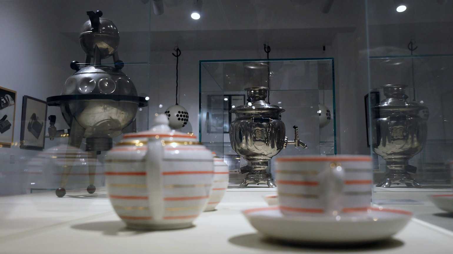 Рядом находится чайный сервиз Малевича. В отличие от поильников, его угловатые формы сложно назвать эргономичными. И это тоже следование мечте: в будущем возможно всё, а удобство — это слишком прозаично.