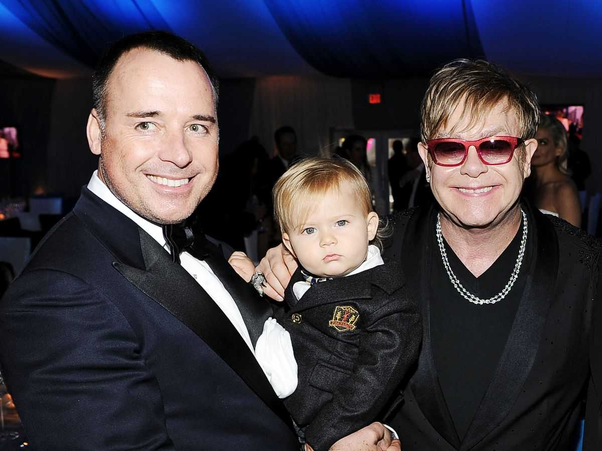 Дэвид Ферниш и сэр Элтон Джон с сыном Захари на 20-й ежегодной церемонии вручения премии Elton John AIDS Foundation Academy Awards, 26 февраля 2012 г.