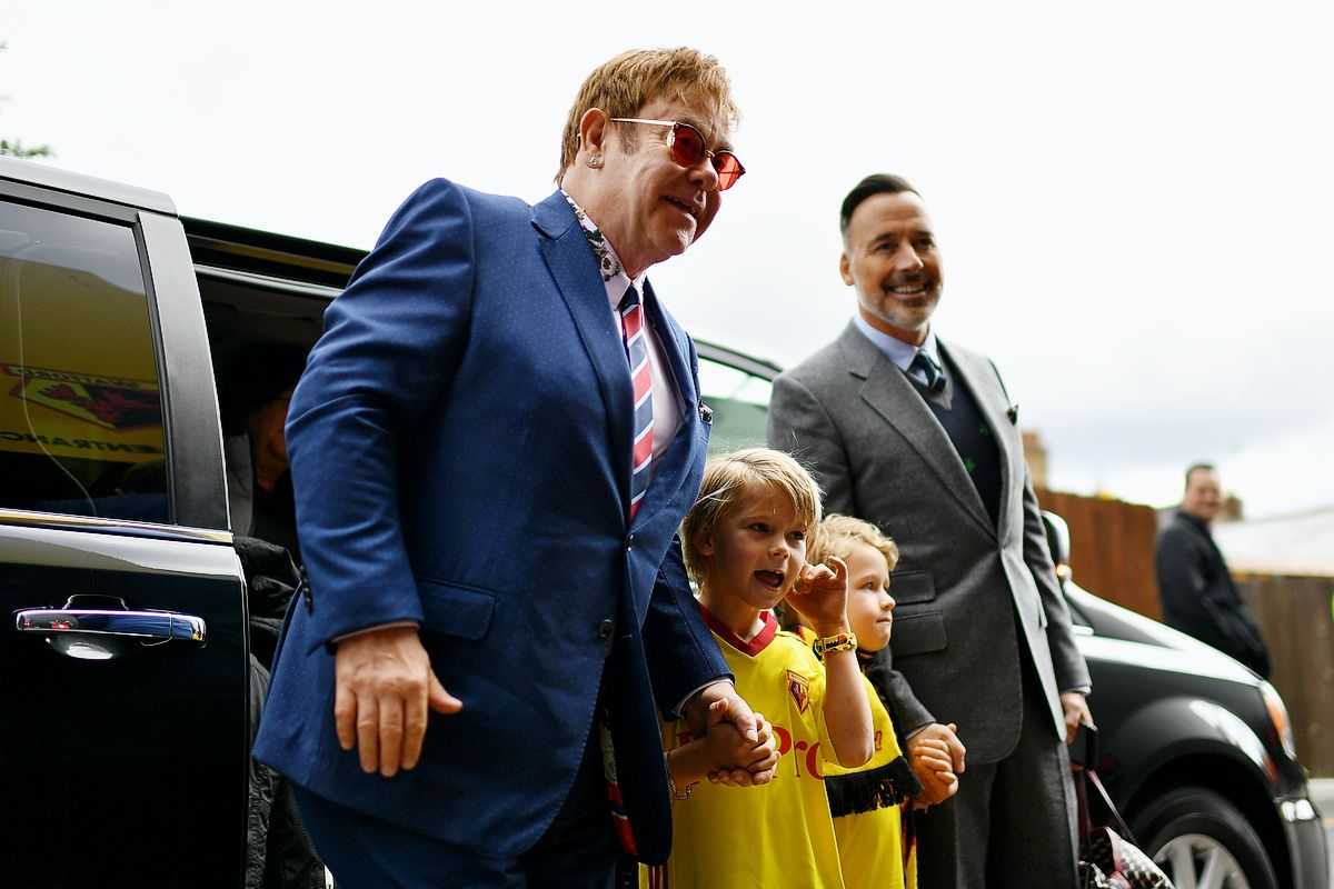 Элтон Джон и Дэвид Ферниш с сыновьями Элайджой Джозефом и Захари Джексоном прибывают на стадион перед матчем Премьер-лиги между Уотфордом и Манчестер Сити, 16 сентября 2017 г.