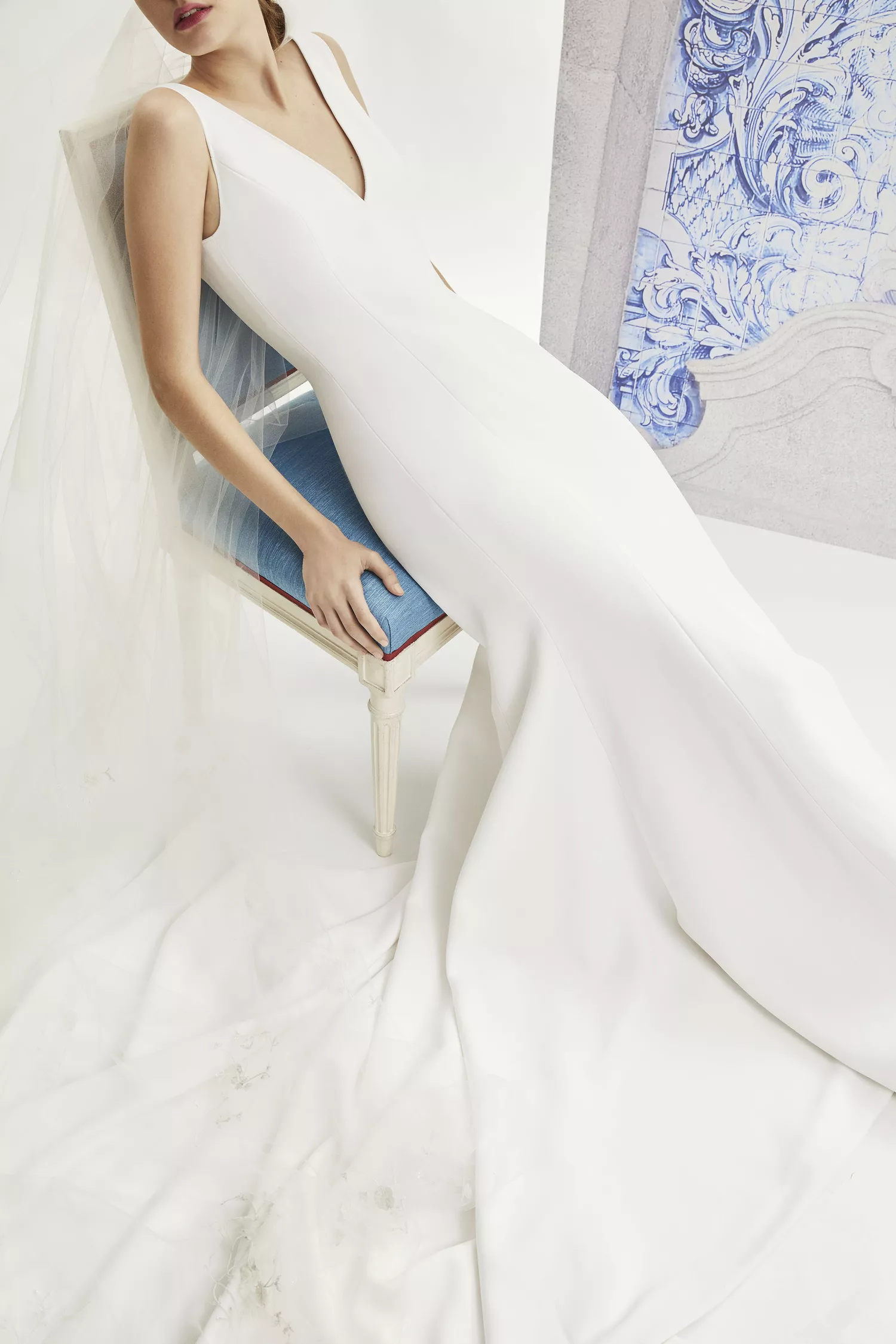 Look 5: Sleeveless silk faille trumpet gown with plunging neckline.