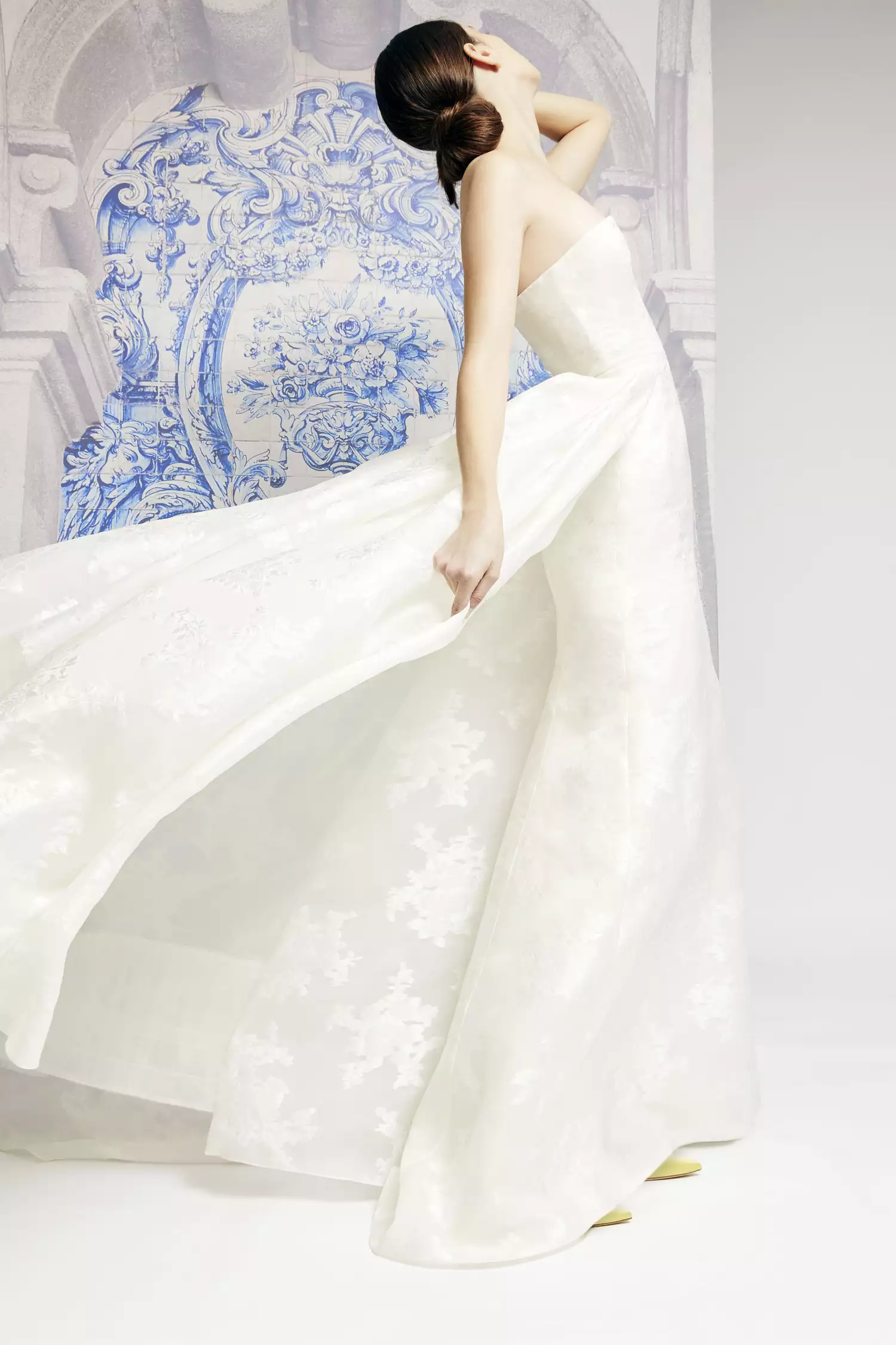 With only 11 dresses, this Carolina Herrera Bridal Fall 2020 collection features a play on silhouettes with sculpted trumpet skirts, imposing A-lines, and dramatic details. The collection also features a lot of textures, including silk mikado, luxe jacquard, and organza overlays, among others. It channels modern drama fit for the contemporary bride.