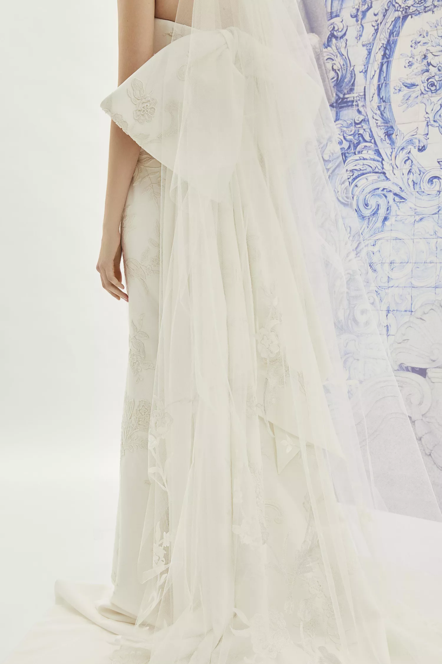 Look 10: Strapless fitted dress with allover floral threadwork embroidery and exaggerated bow detail on back.