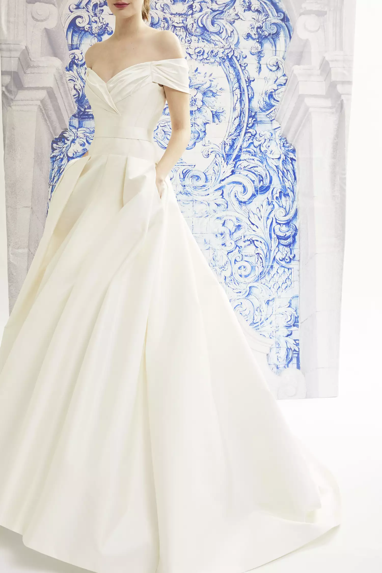 Look 13: Off-the-shoulder silk mikado gown with sweetheart neckline, ruching on bodice, waist sash, and pockets.