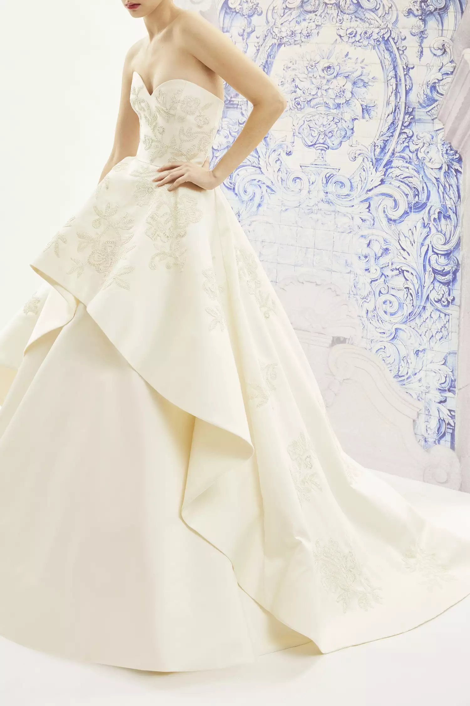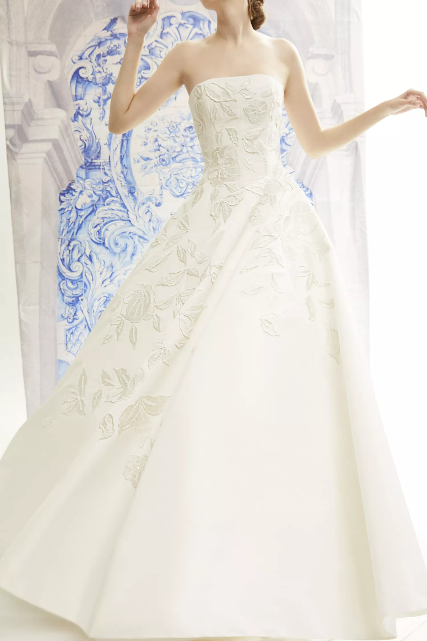 Look 8: Strapless silk mikado ball gown with floral threadwork embroidery.