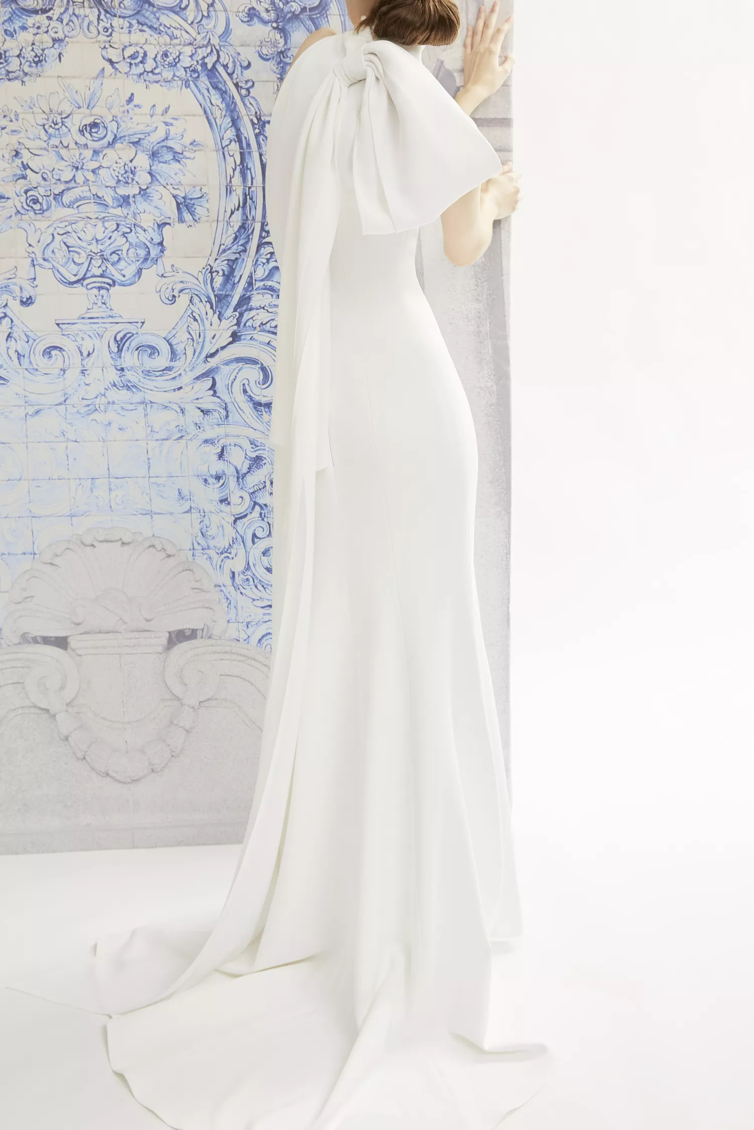 «Mercer» long-sleeve crepe trumpet wedding dress with scooped back.