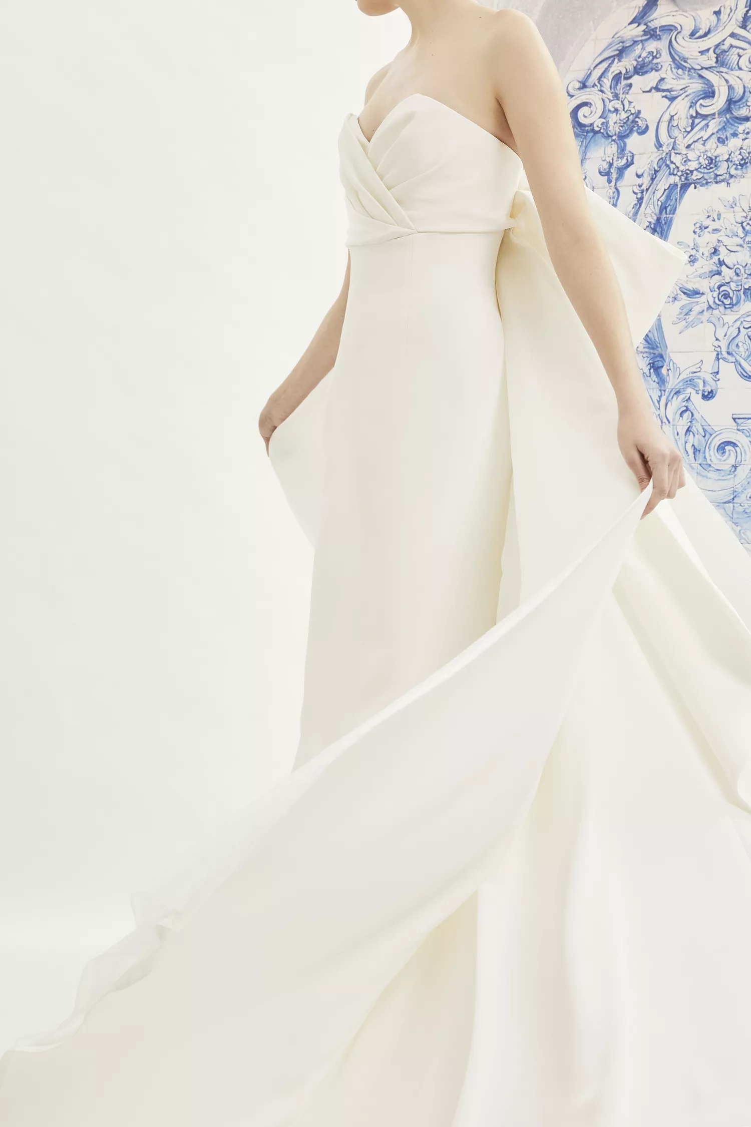Look 6: Strapless silk faille gown with sweetheart neckline, ruching on bodice, and oversized bow that extends to train.