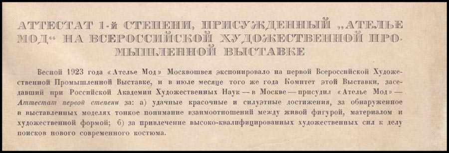 Также на выставке был показан целый ряд образцов одежды, которые разработали художники «Ателье мод», созданного при Москвошвее. Комитет Выставки, заседавшей при Российской Академии Художественных Наук в Москве присудил «Ателье Мод» – Аттестат первой степени за:а) удачные красочные и силуэтные достижения, за обнаруженное в выставленных моделях тонкое понимание взаимоотношений между живой фигурой, материалом и художественной формой;б) за привлечение высоко-квалифицированных художественных сил к делу поисков нового современного костюма.