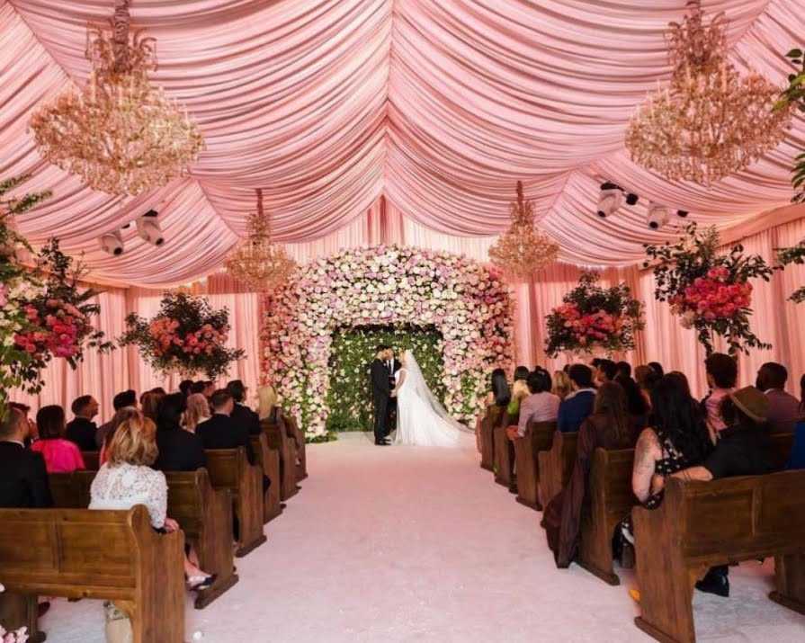 В итоге певица предпочла привычную домашнюю атмосферу экзотической локации и провела свадебную церемонию в стиле диснеевской Золушки в своем доме в калифорнийском городке Таусенд-Окс. Особняк, напоминающий римские палаццо, довольно живописен и эффектно смотрится на свадебных фото и видео: колонны, стрельчатые окна, резные балкончики, балюстрады, восхитительный окружающий ландшафт. Для церемонии на прилегающей к дому территории соорудили большой шатер, крытый розовым шелком, украшенный живыми цветами и драгоценными люстрами. Внутри располагалась цветочная арка-стена из зелени, розовых и белых роз, деревянные скамьи для приглашенных. В цветовом оформлении свадьба Бритни Спирс-2022 традиционна: певица отдала предпочтение нежной бело-розовой, кремовой и золотой гамме. Цветочными гирляндами украсили также: