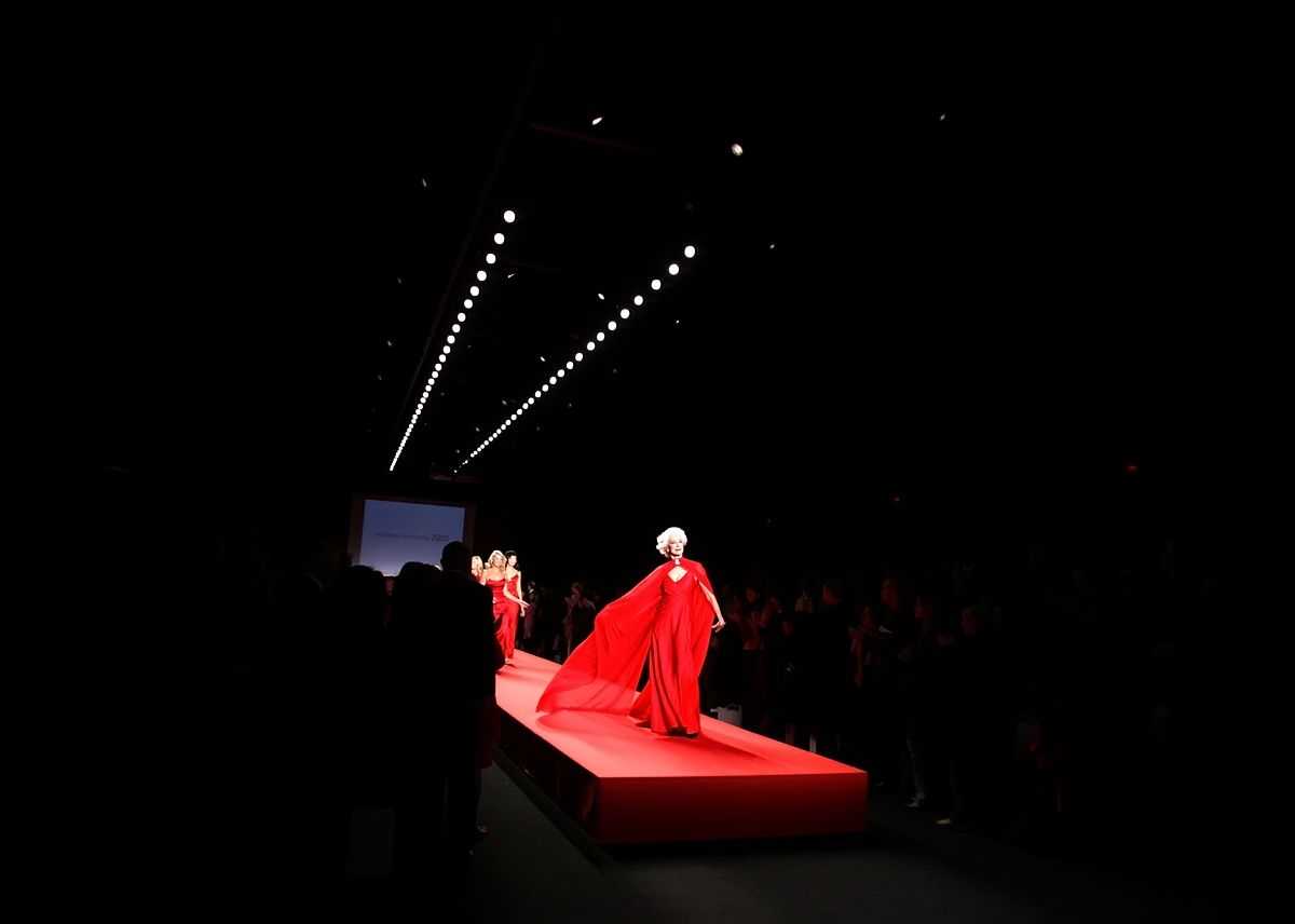 Кармен Делль’Орефиче на подиуме в коллекции красных платьев Heart Truth во время Недели моды Olympus в Нью-Йорке, 4 февраля 2005 г.