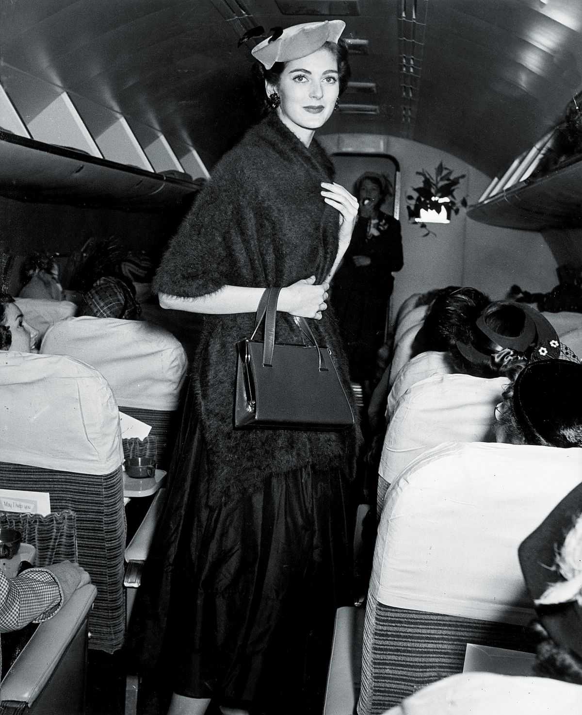 Кармен Делль’Орефиче в шляпе и мохеровом платке, а также с сумочкой идет по проходу самолета во время показа мод, 1955 г.