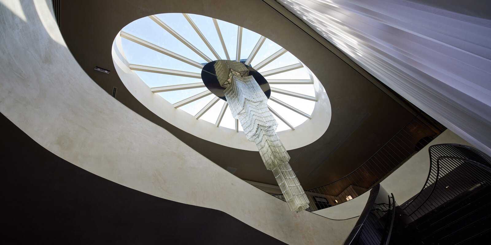 Нельзя не заметить и авангардную конструкцию на потолке, реставраторы называют ее «фонарь». «“Фонарь” и лестница — наше самое серьезное вторжение в историческое здание», — говорит Дарья Парамонова.