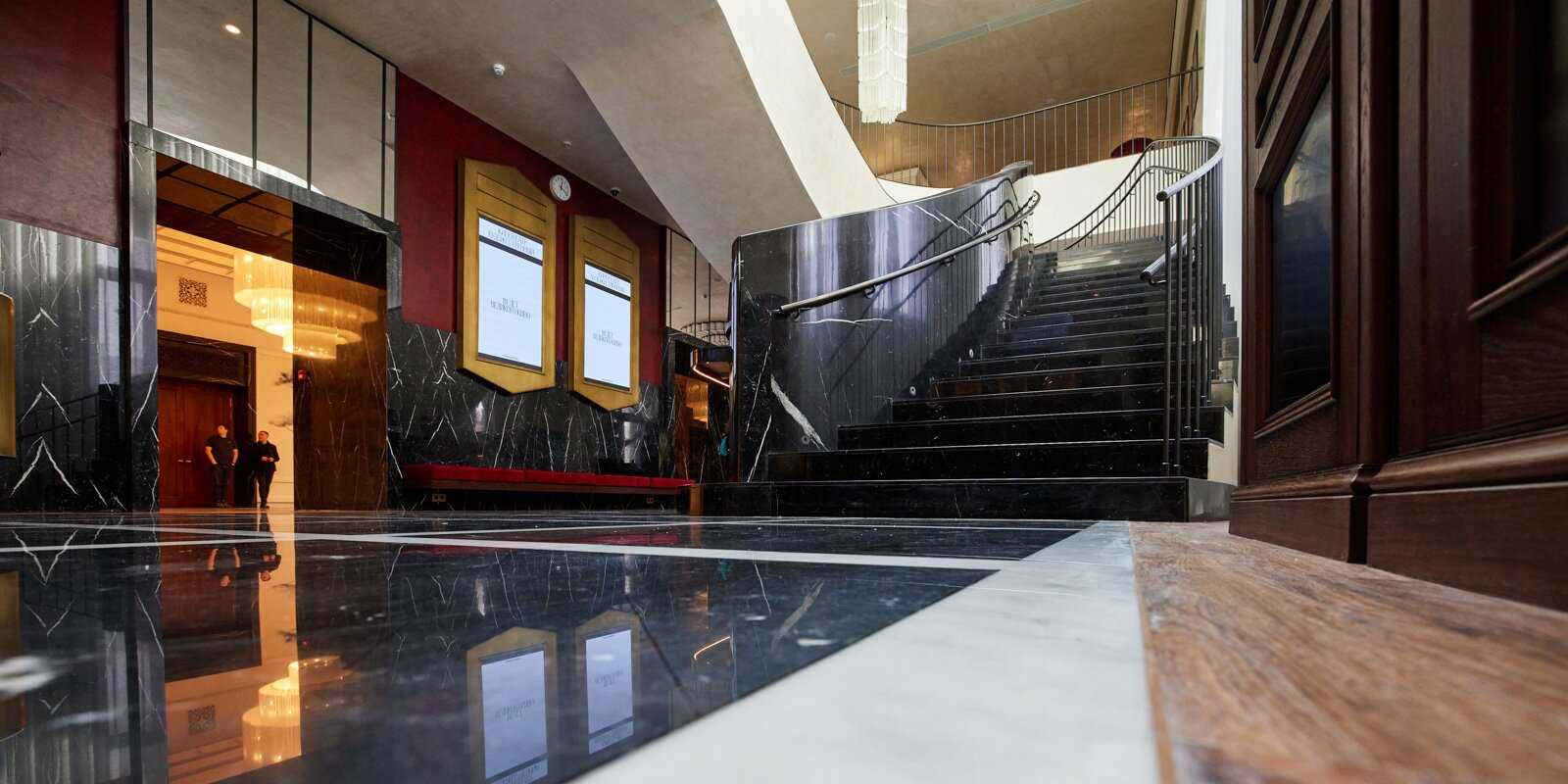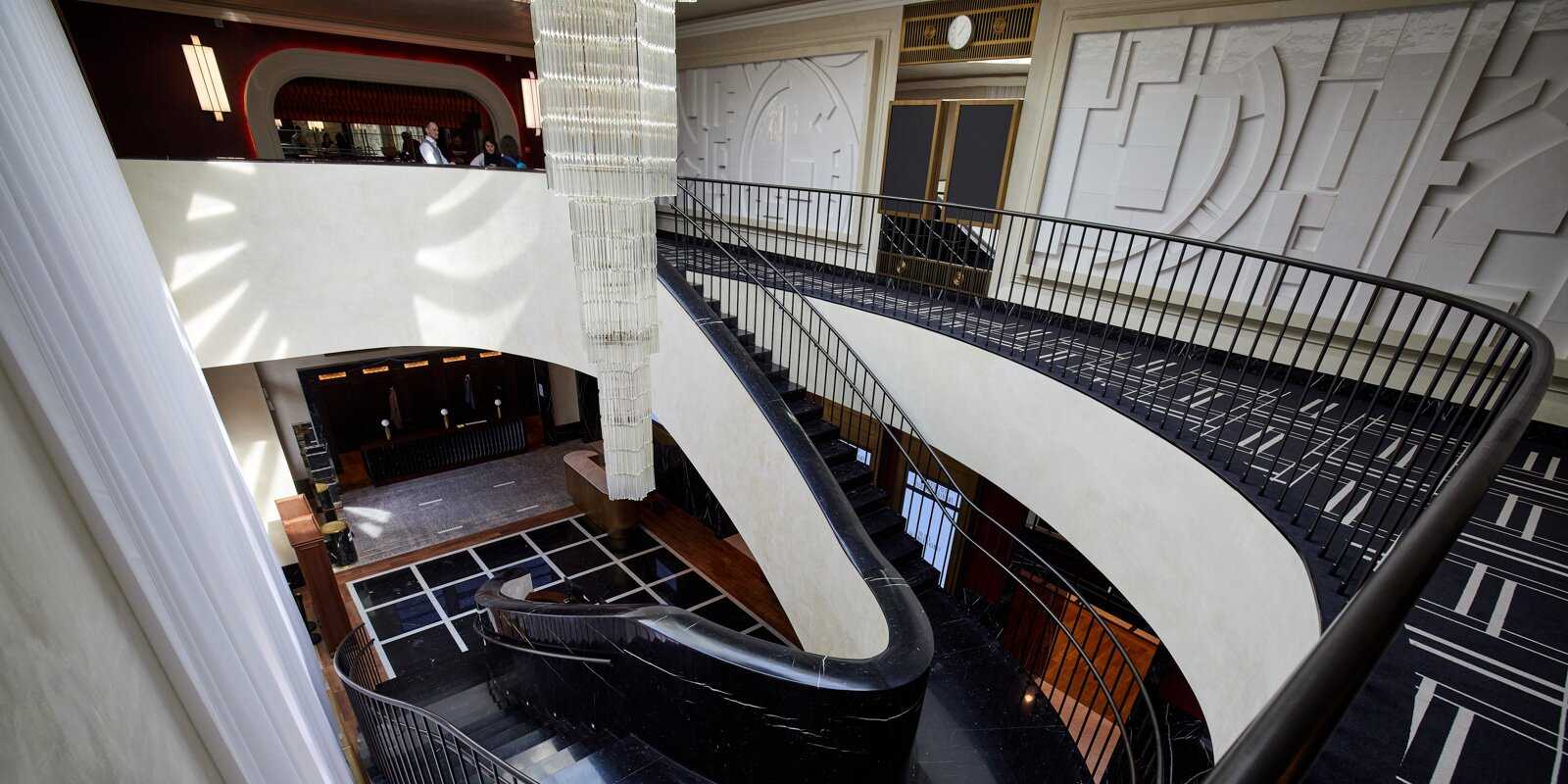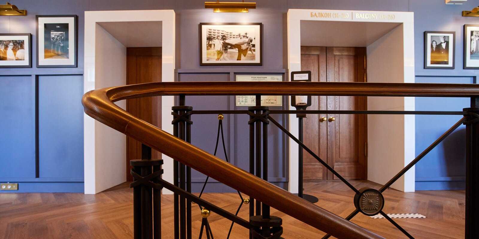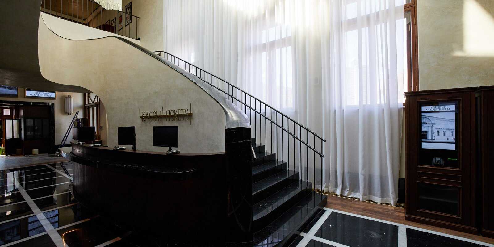 «Лестница, ведущая в северное фойе, историческая, спроектирована Федором Шехтелем. От оригинала остались лишь две ступеньки. Остальные мы перебрали, скомпоновали. Но в целом дизайн лестницы остался прежним. Деревянный поручень тоже изготовлен по проекту Шехтеля. Мы взяли аналогичный из дома на Большой Садовой, где жил архитектор, и сделали реплику», — раскрывает секреты Денис Писарев.
