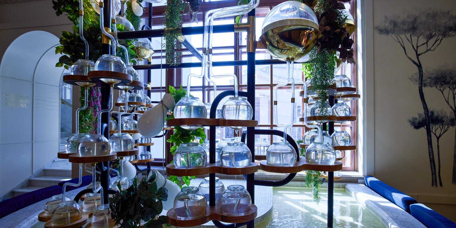 Новый фонтан гармонирует с витражом. Это система металлических прутьев, колб и стеклянных шаров, через которые течет вода. Между ними горшки с живыми цветами-вьюнками. Оранжерея — еще одна задумка Шехтеля, которая была уничтожена в советское время.