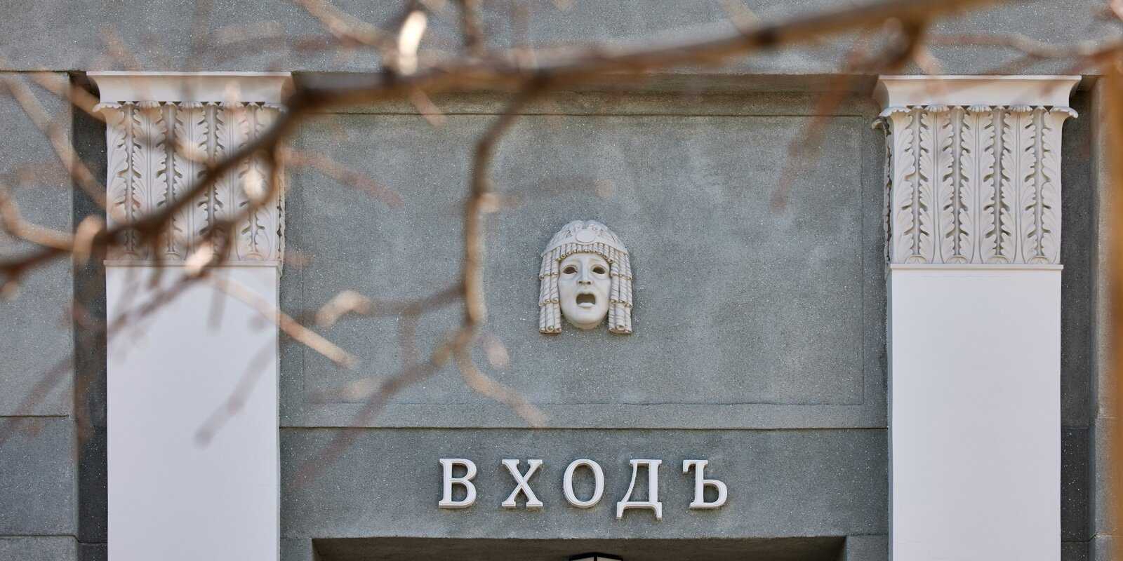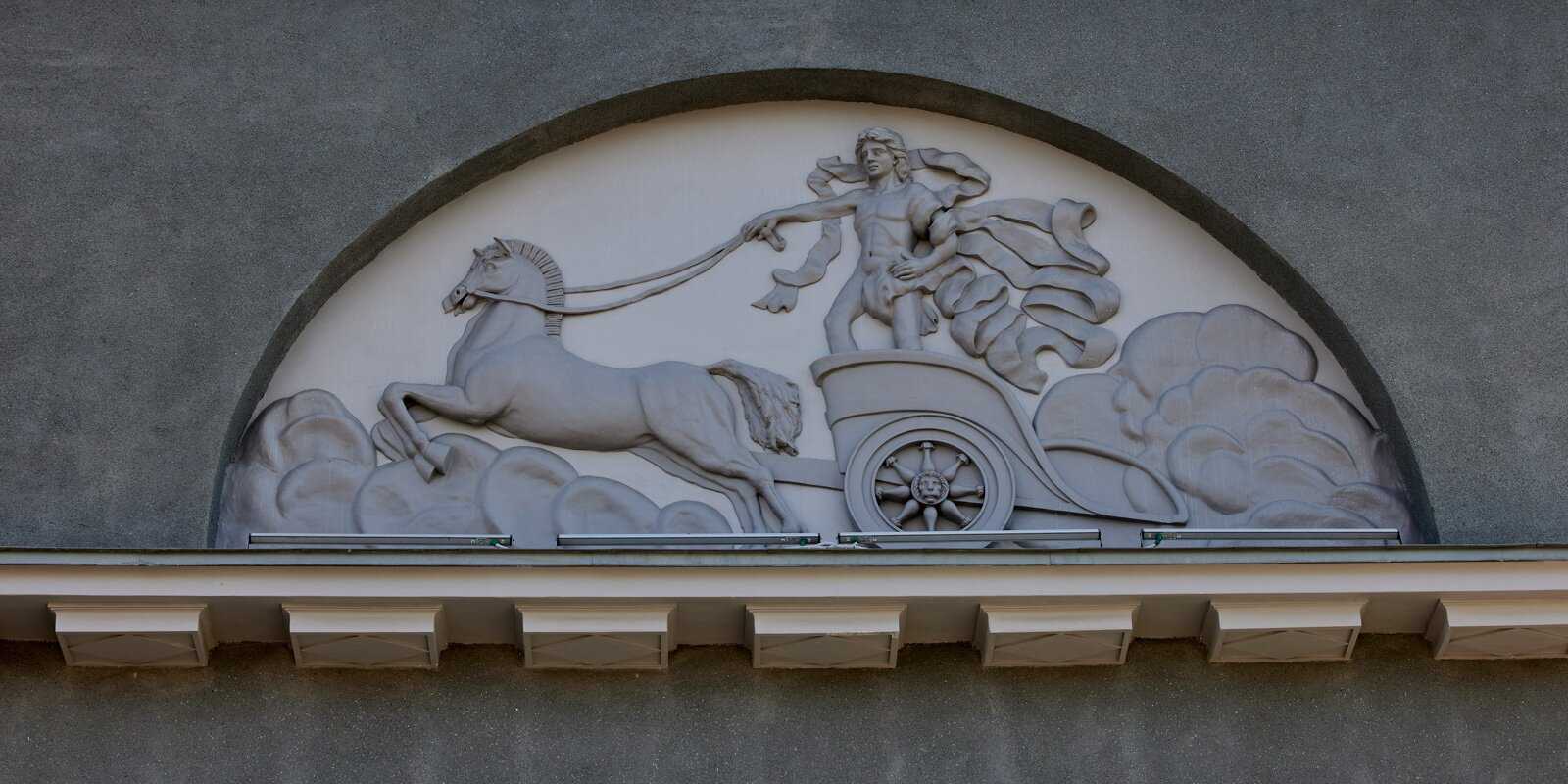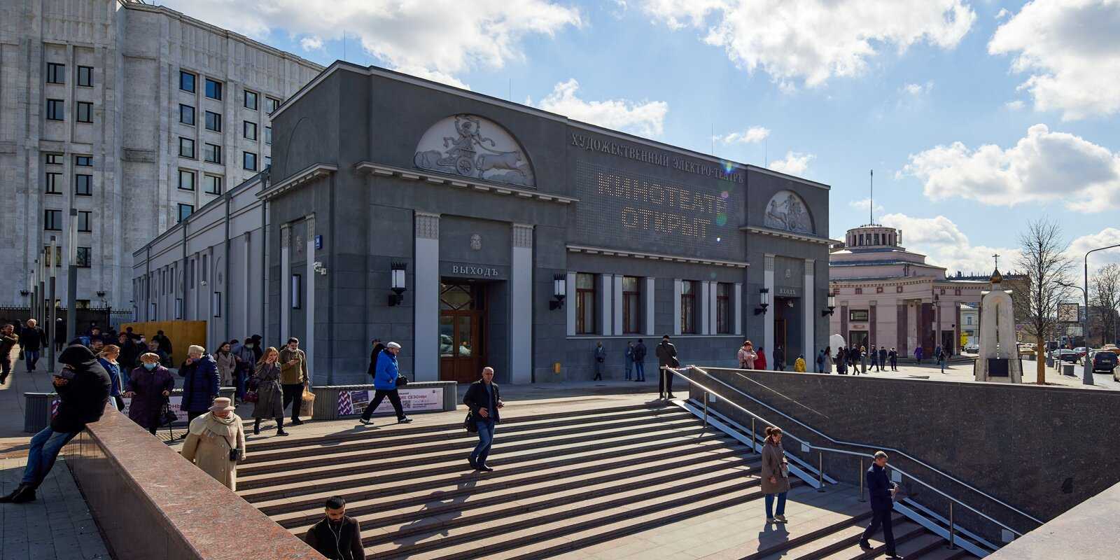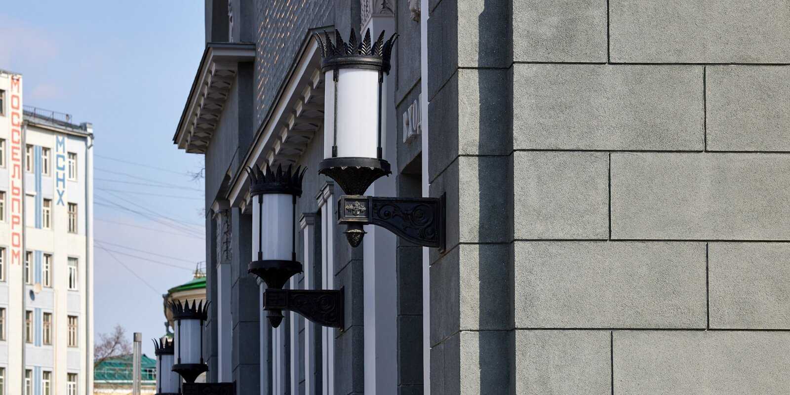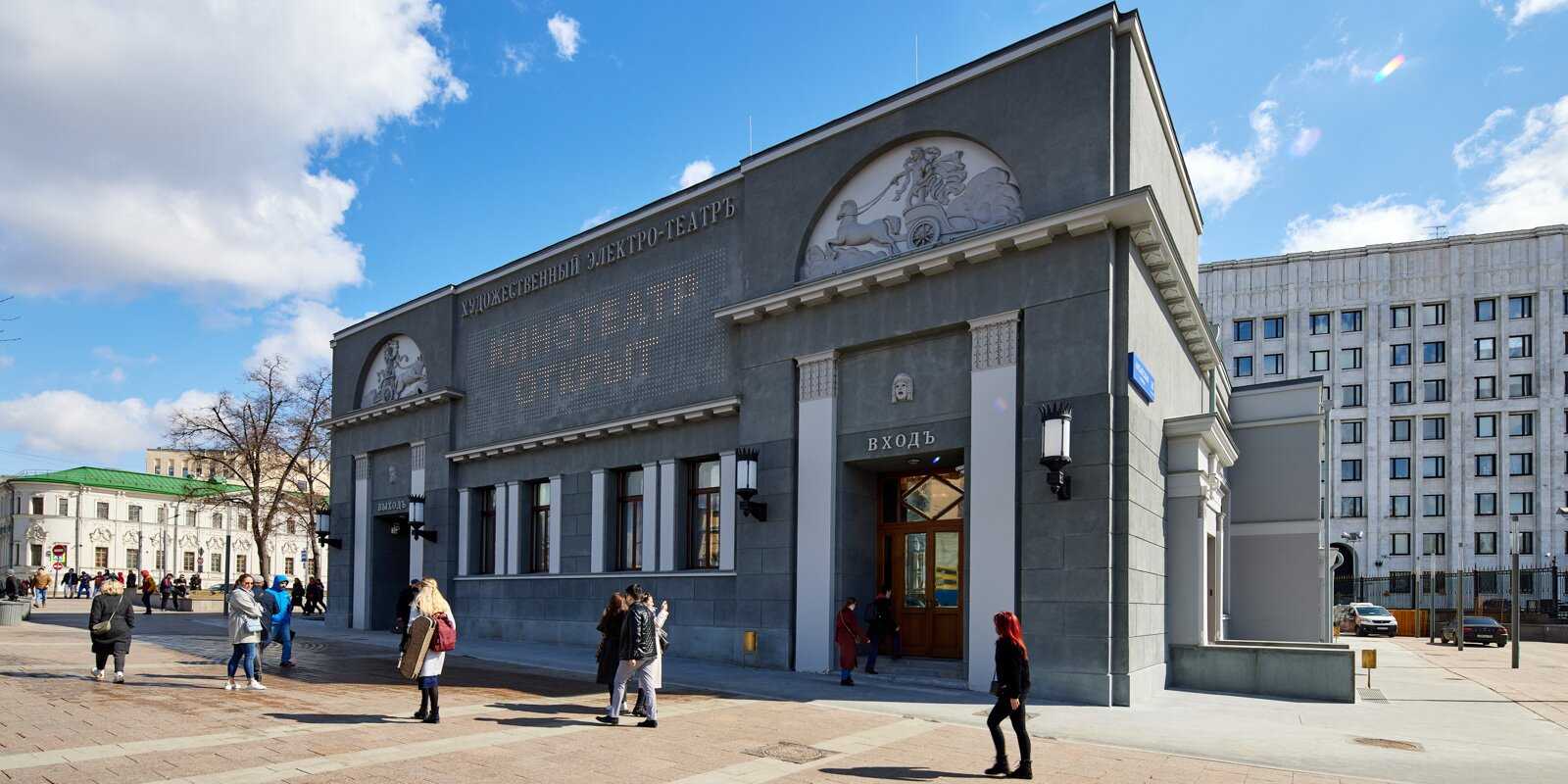 Серый со сверкающей слюдой фасад «Художественного» вновь украшают белые колонны, над входом и выходом — барельефы в античном стиле в виде голов мужчины и женщины, а в нишах под крышей — кони, мчащие колесницу с богом солнца Гелиосом, и быки, неспешно везущие колесницу с богиней луны Селеной. Здесь же красуется надпись «Художественный электро-театръ» — такая же, как во времена Федора Шехтеля.