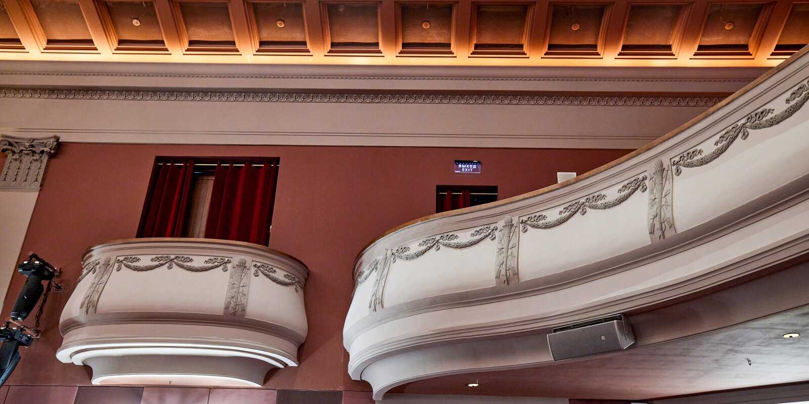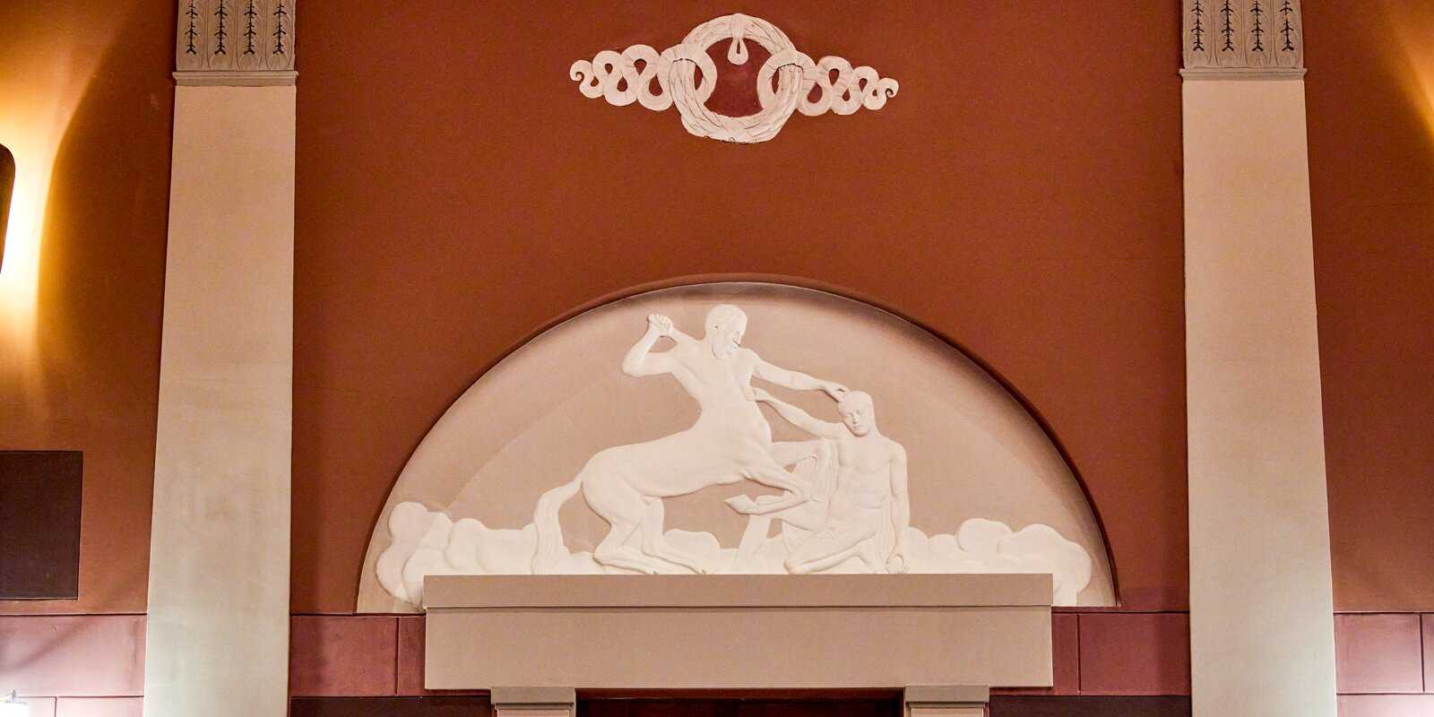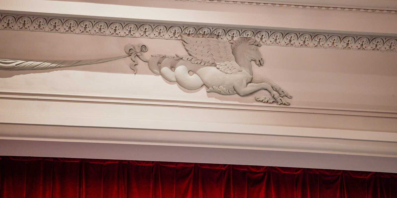 Правда, из-за наложения акустической штукатурки пришлось законсервировать барельефы-венки над бывшими входами в кинозал. Оригиналы оказались внутри стен, а поверх штукатурки нанесли их реплики. Зато барельефы над дверями, изображающие битвы кентавров с лапифами, удалось сохранить.