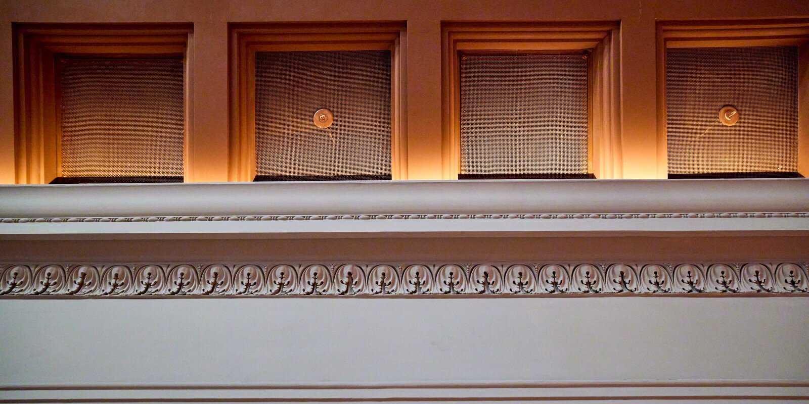 Кессонный потолок не просто дань памяти архитектуре Шехтеля. Рамки играют особую роль: между ними вмонтирована звуковая техника.