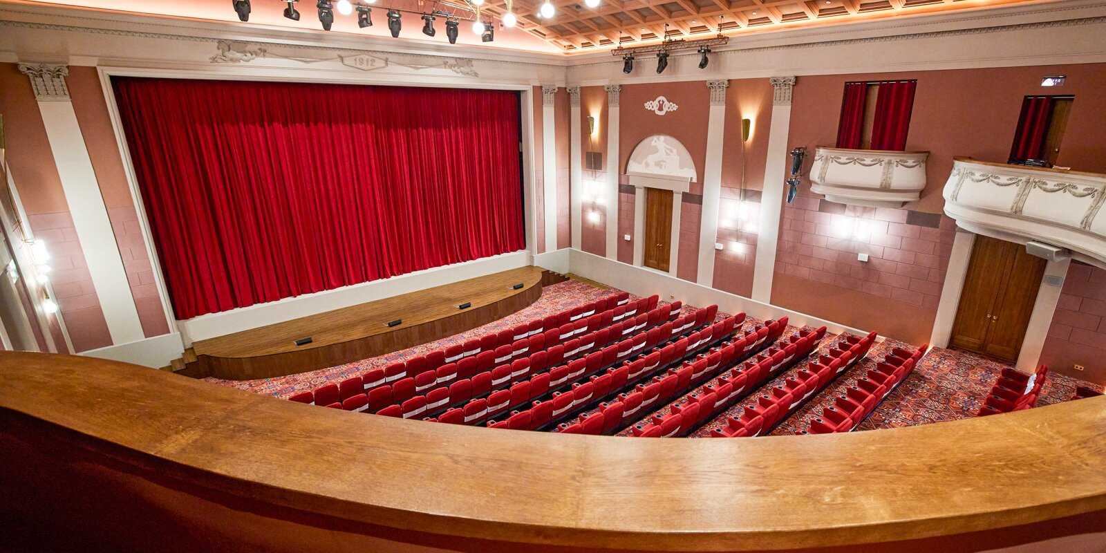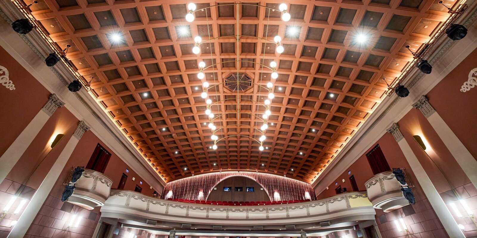 В операторской за балконом реставраторы нашли фрагменты шехтелевского кессонного потолка: такой был над всем залом, но в 1950-е годы его заменили на обычный, с побелкой. Под слоем краски спряталась и решетка, на которой держалась люстра. Сейчас потолок, состоящий из фиброцемента, как и витраж в фойе, изготовили заново с намеком на кессоны Шехтеля, а решетку расчистили. Оказалось, ее вершины увиты акантовыми листьями.