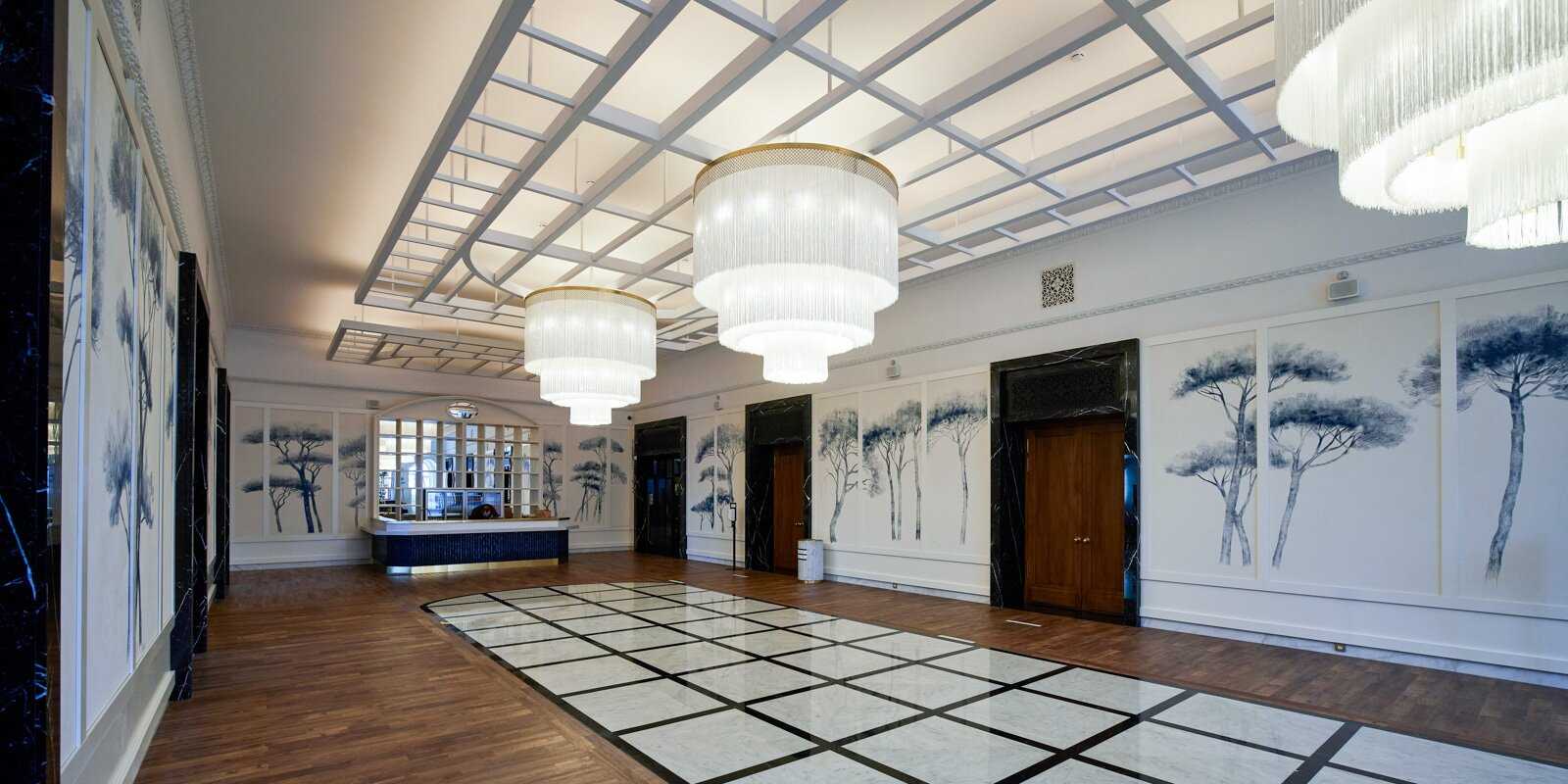 Когда реставраторы приступили к работе в главном фойе кинотеатра, за его потолком обнаружилось тоже что-то вроде чердака. Этот гипсовый потолок — наследие советских времен. Он закрывал спроектированные Шехтелем два лепных карниза и алебастровые вентиляционные решетки, будто сплетенные из стеблей и цветов. Карнизы полностью восстановили, вылепив новые элементы по образцам уцелевших.