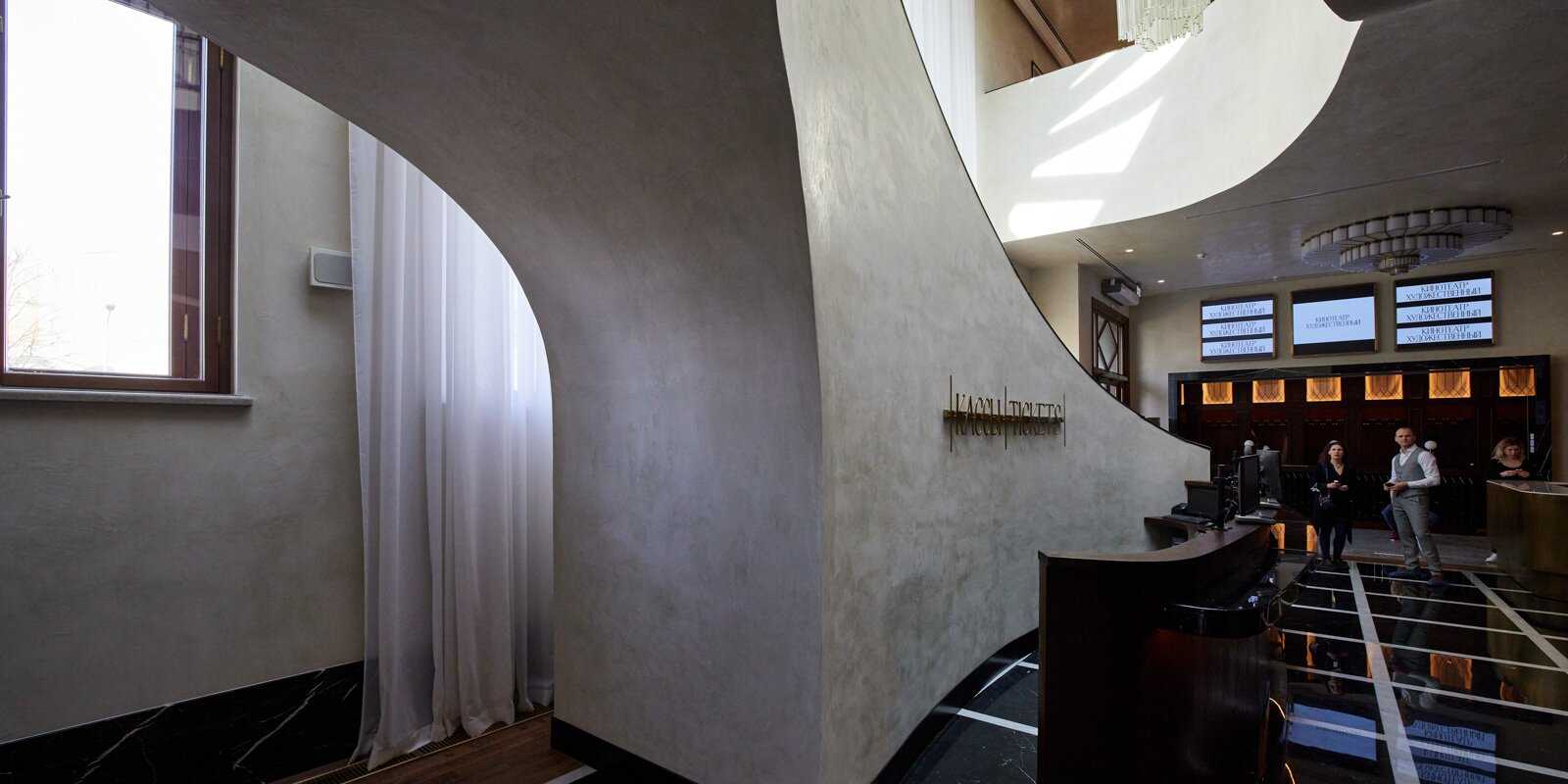 «Мы решили выложить стены акустической штукатуркой. Она состоит из множества шариков, которые наносят в несколько слоев. Полости между ними глушат шум. Сделали из этой штукатурки русты — стилизованные камни по чертежам Шехтеля. То есть применили технологию на стыке реставрации и приспособления», — уточняет Дарья.