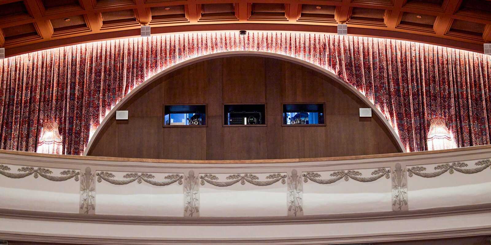«Обычно кинозалы увешаны колонками. Это необходимо. Но в исторический антураж они не вписываются. И наша команда специально летала в Лондон на встречу со специалистами по звуку, которые спроектировали 54 колонки для этого зала. Часть техники спрятана под потолком, а часть — за стенами», — объясняет Дарья Парамонова.