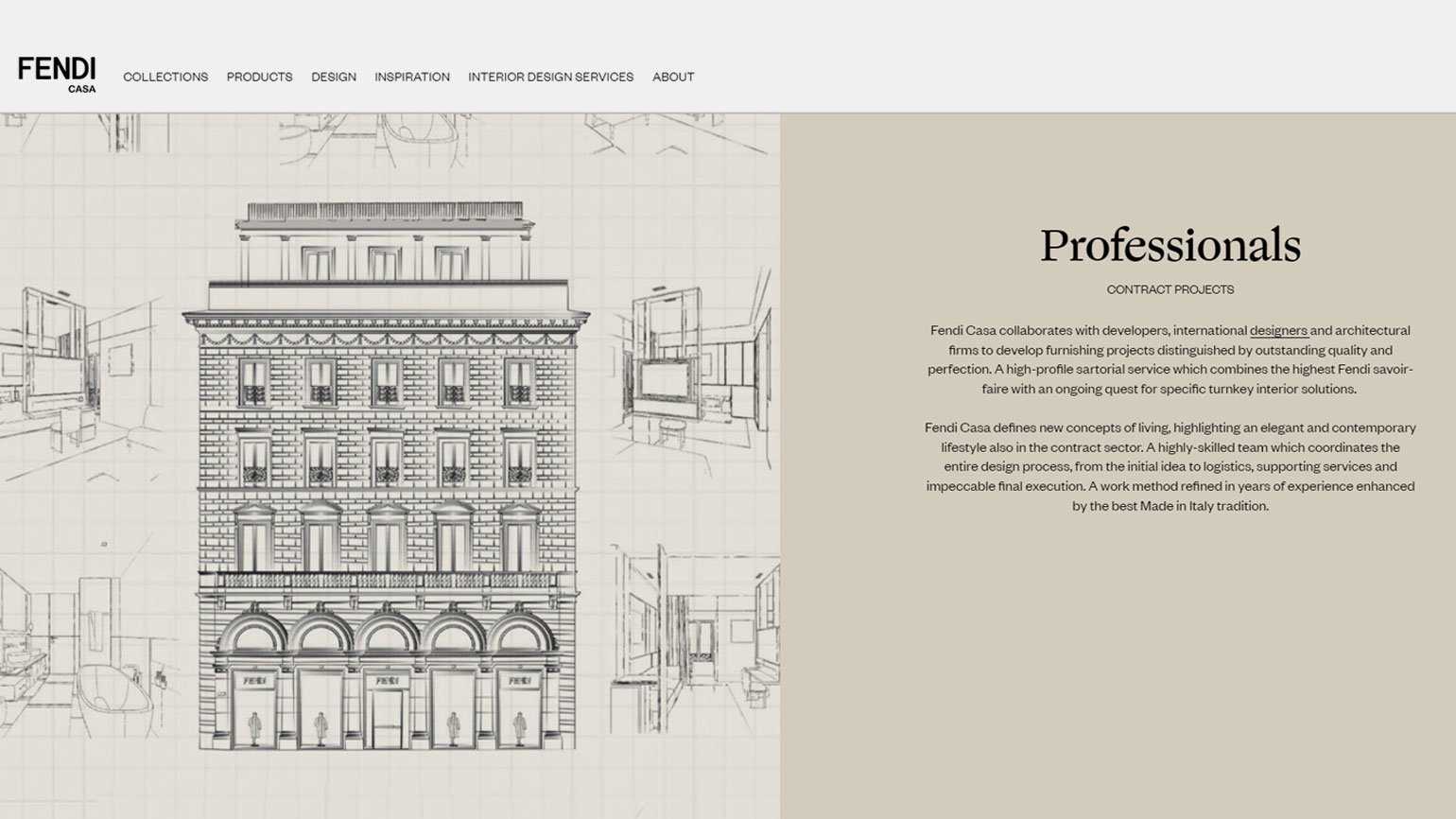 Серо-бежевый в айдентике Fendi Casa работает как отсылка к цвету знаменитого здания компании — Palazzo della Civiltà в РимеСкриншот: сайт Fendi Casa / Skillbox Media