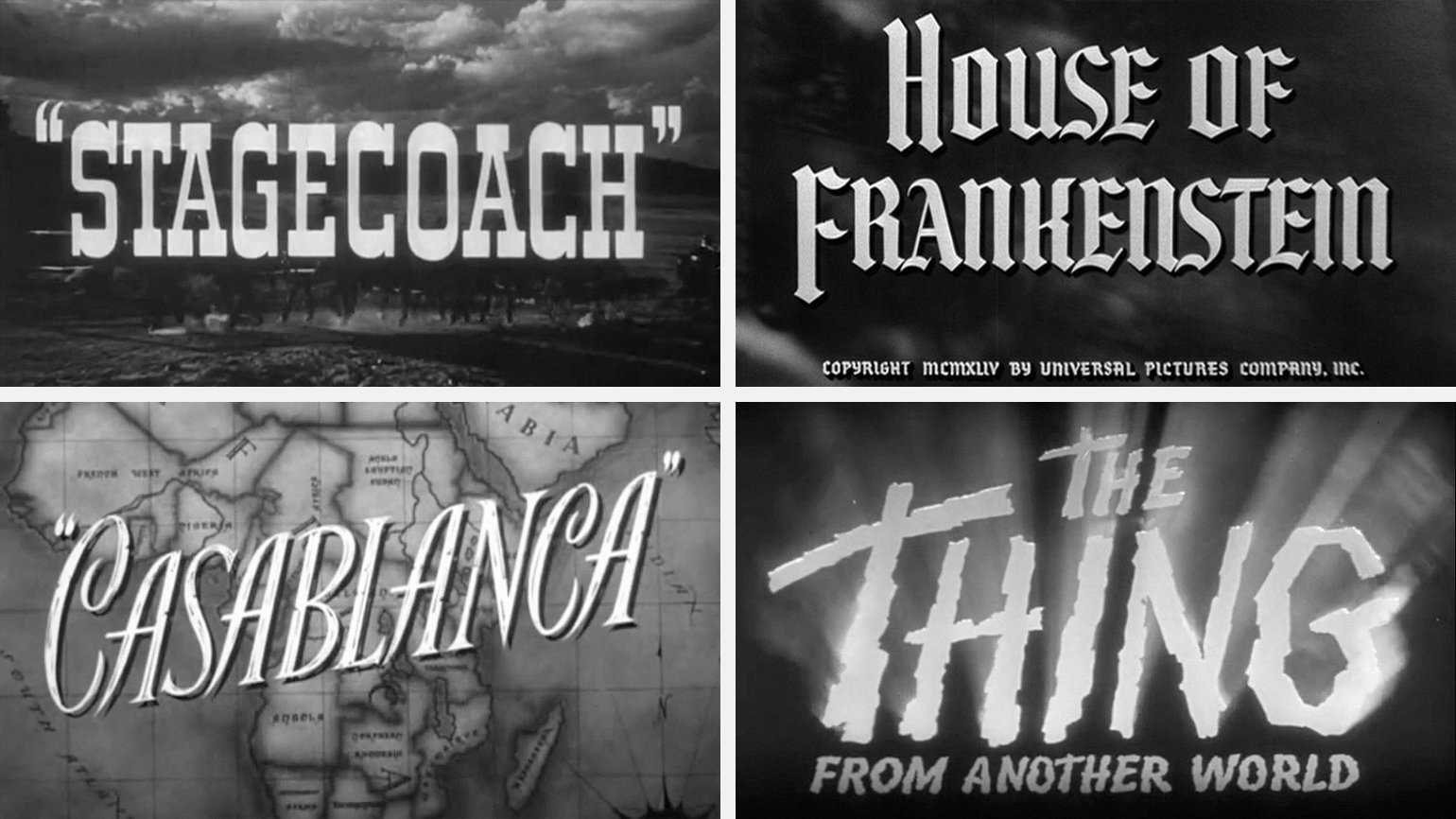 Использование типографики в логотипах фильмов разных лет. Кадр: фильм «Дилижанс» / «Дом Франкенштейна» / «Касабланка» / «Нечто из иного мира»