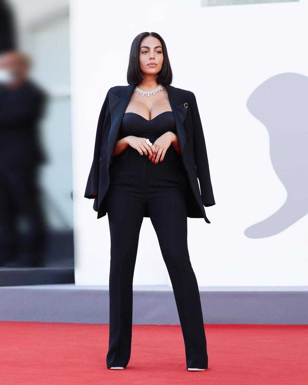 Так поступила и Джорджина Родригес, выбрав чёрный totallook для визита на Венецианский кинофестиваль. Узкие брюки, чёрный жакет, такой же чёрный топ с глубоким декольте дополняло роскошное бриллиантовое колье. Восхитительно!