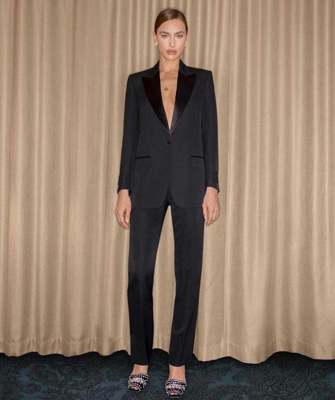 Похожий, но чуть более провокационный аутфит в чёрном продемонстрировала Ирина на церемонии BAFTA в2019 году. Тогда модель выбрала довольно строгий чёрный костюм, надев его на голое тело. В этом раунде молодцы обе, один-один.