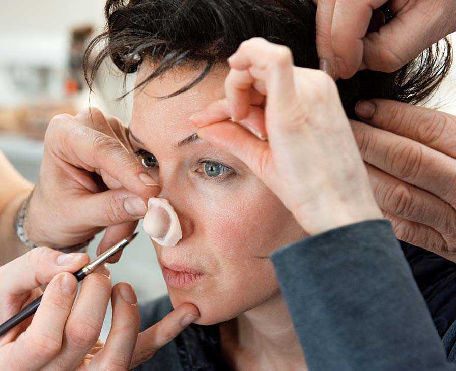Отвечавший за прическу и макияж Джереми Вудхед рассказывает: «Мы изменили в Рене буквально все. Использовали протез для носа. «Опустили» с помощью макияжа линию подбородка. Взяли косметические линзы и поменяли голубой цвет глаз Рене на карий. А еще создали искусственные морщинки, «гусиные лапки» и темные круги под глазами. Ну и про тяжеленные накладные ресницы не забыли».