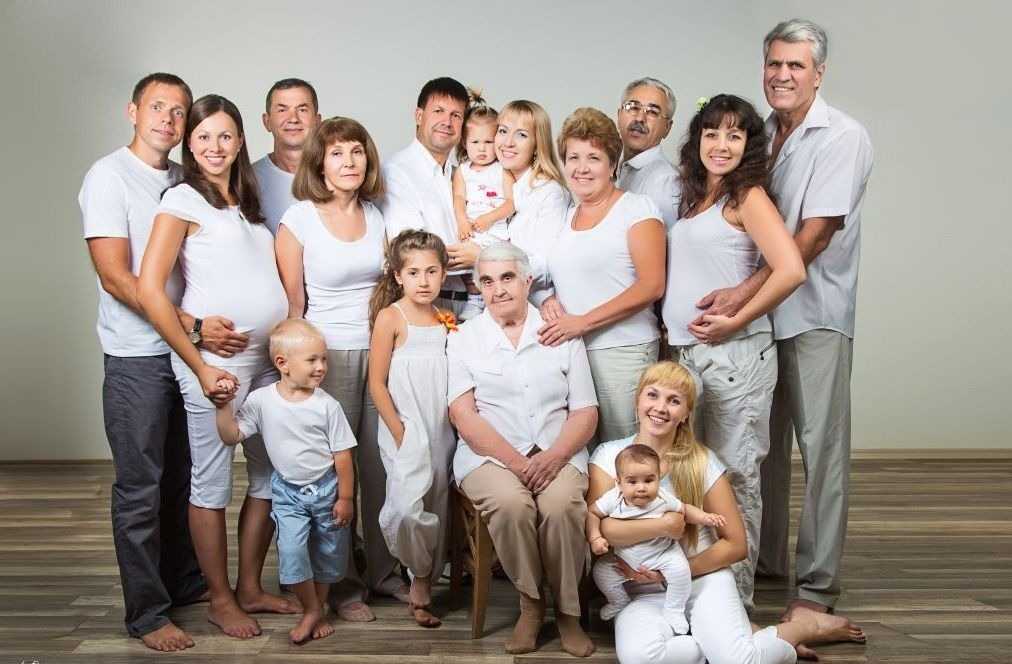 Чаще всего в семейной фотосессии участвуют родители и их дети. Все популярнее приходить на съемку целыми поколениями. В этом случае в кадре будут родители, дети, внуки, а иногда и правнуки. Для интересного фото участники съемки могут расположиться на разных уровнях, тем самым заполнить собой весь кадр. В качестве интерьера и декораций подойдут лестницы, скамейки, диваны, стулья. Внуки могут сидеть на руках или на коленях у старшего поколения, взрослые стоять или уютно расположиться на полу.