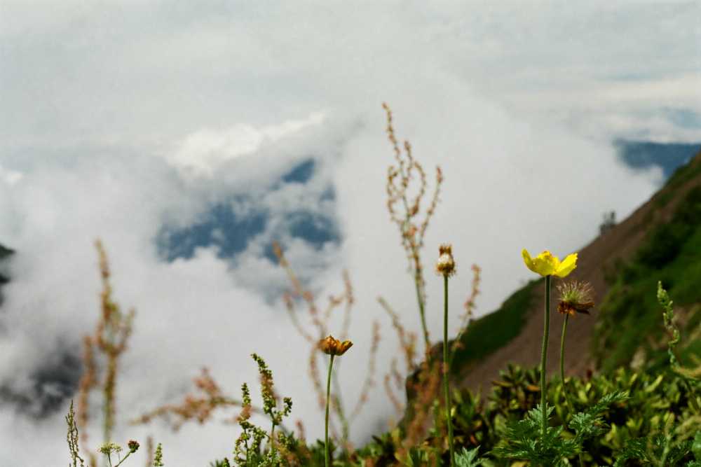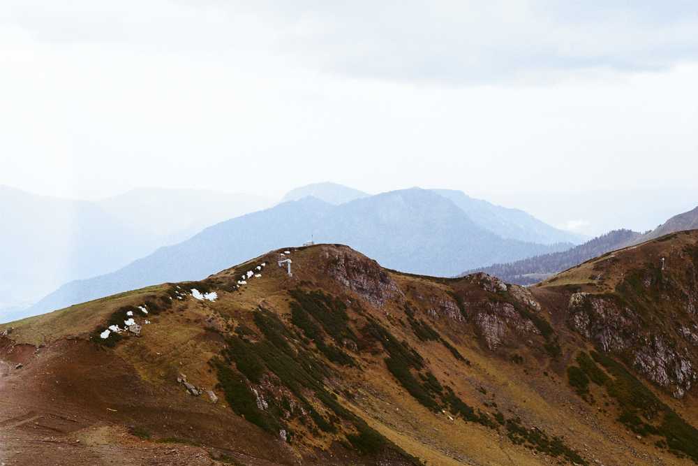 По канатной дороге «Эдельвейс» поднимаемся вверх, на высоту «Роза Пик» (2320 метров). До смотровой площадки «Каменный Столб» (2509 метров, высшая точка хребта Аибга) мы не смогли добраться, погода не позволила — дождь и ветер усилились.