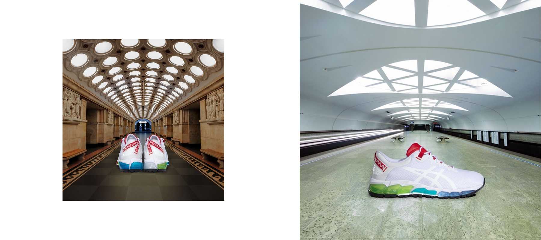 Японский бренд спортивной одежды и обуви Asics вместе с московским метро создали оригинальный мерч – лимитированную модель кроссовок. Дизайн кроссовок принадлежит рукам Артемия Лебедева. В дизайне использованы цвета линий метро, а на шнурках – узор с логотипами партнеров.